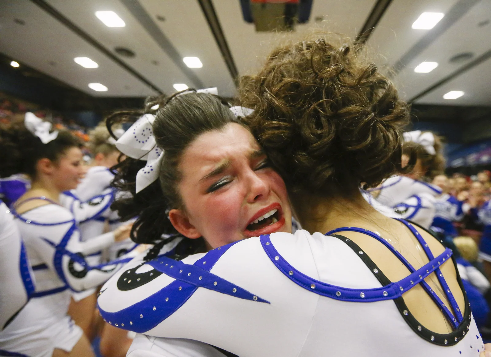 Lewiston cheerleader Maraeka Merchant cries tears of joy after the announcer calls out their championship victory at the Maine State Cheerleading Championships at the Augusta Civic Center in Augusta, ME on Saturday, February 7, 2015